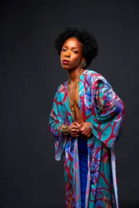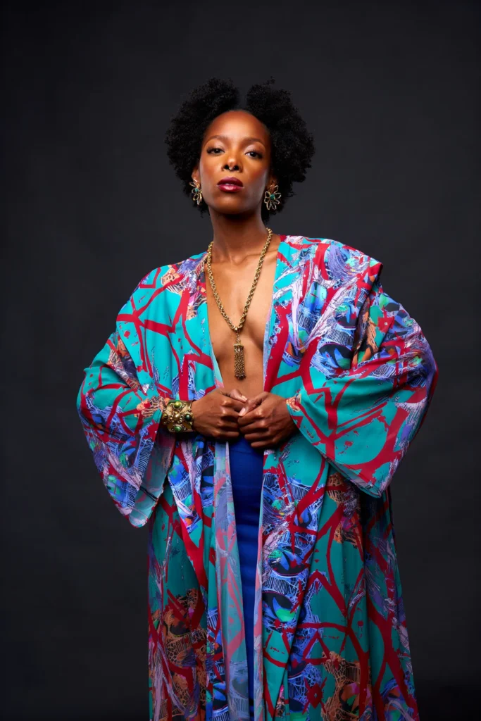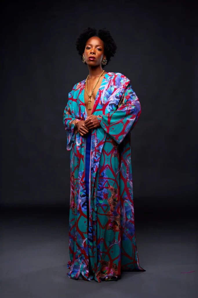 • Azure Prism – open-front kaftan with contrast panel lining, soft lapel framing and back drape detail