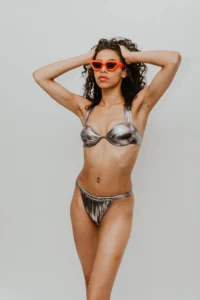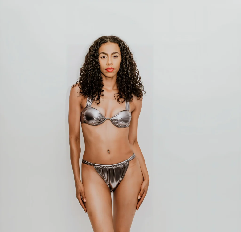 A high-shine gunmetal bikini set with sculpted edges and a sleek, second-skin fit that defines modern luxury swimwear.