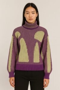 with volumed sculpted sleeves, contrasting panel details, and a soft ribbed turtleneck, this